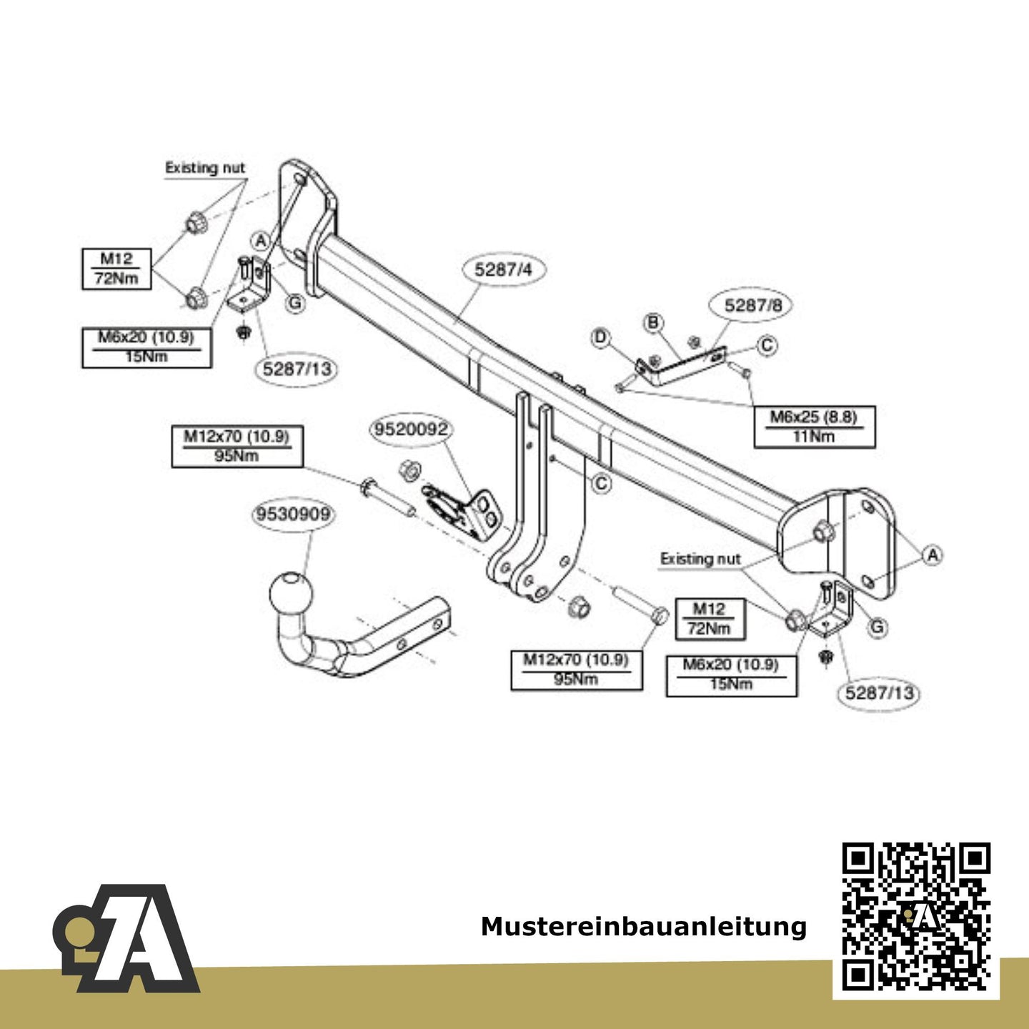 Die Anbauzeit hängt vom Fahrzeugtyp, der gewählten Kupplung und dem Elektrosatz ab. In vielen Fällen ist der Einbau innerhalb von etwa drei Stunden erledigt. Bei aufwendigeren Montagen, etwa bei schwenkbaren Systemen oder schwieriger Fahrzeuggeometrie, kann es auch länger dauern. Besonders der Anschluss des Elektrosatzes sollte von Fachpersonal übernommen werden, um Fehler im Bordnetz zu vermeiden. Die geschätzte Montagedauer für dieses Modell beträgt 2h. Diese Angabe richtet sich an Fachwerkstätten und ist ein Richtwert – je nach Fahrzeugmodell und Elektrosatz kann es etwas schneller oder langsamer gehen.