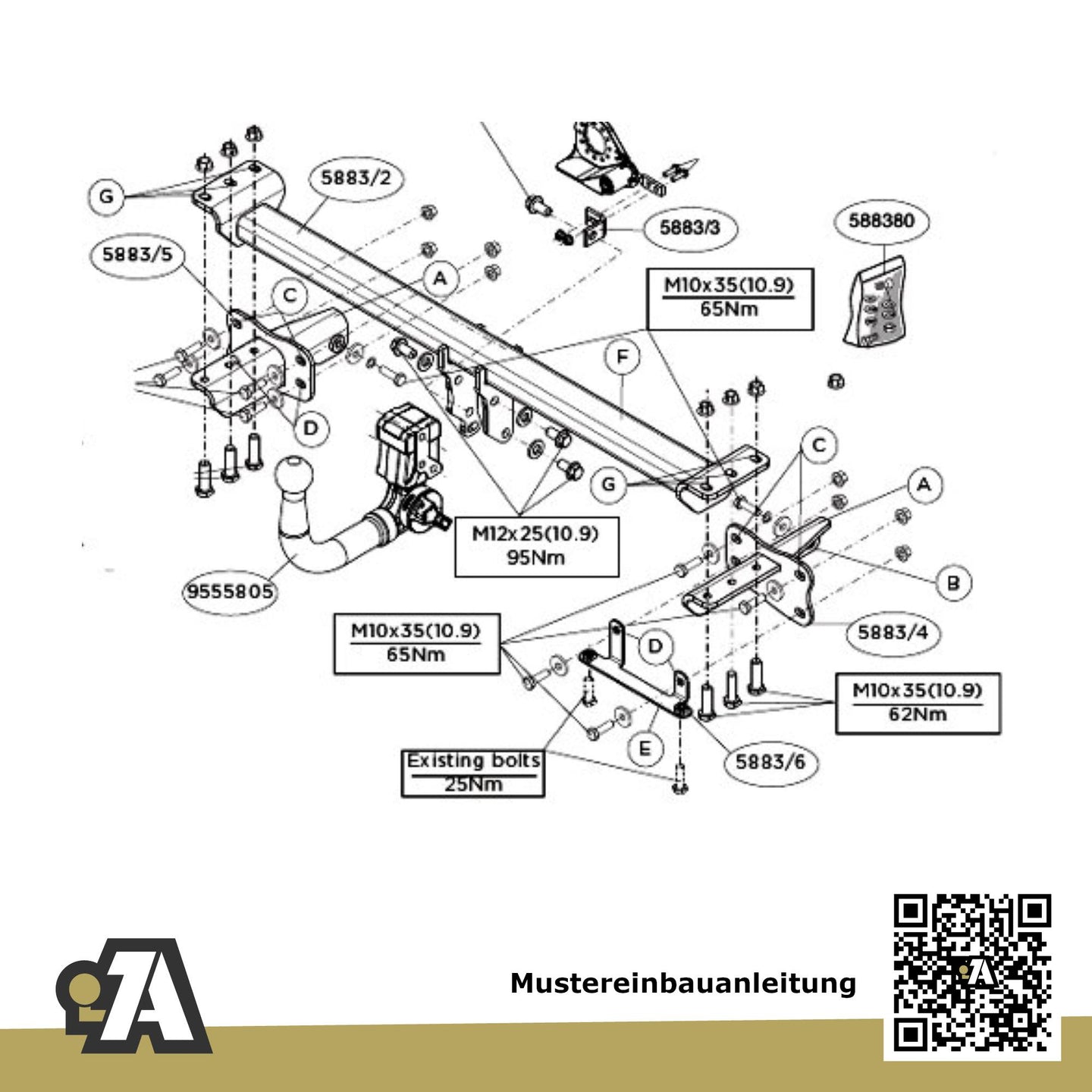 Die Anbauzeit hängt vom Fahrzeugtyp, der gewählten Kupplung und dem Elektrosatz ab. In vielen Fällen ist der Einbau innerhalb von etwa drei Stunden erledigt. Bei aufwendigeren Montagen, etwa bei schwenkbaren Systemen oder schwieriger Fahrzeuggeometrie, kann es auch länger dauern. Besonders der Anschluss des Elektrosatzes sollte von Fachpersonal übernommen werden, um Fehler im Bordnetz zu vermeiden. Die geschätzte Montagedauer für dieses Modell beträgt 1,5h. Diese Angabe richtet sich an Fachwerkstätten und ist ein Richtwert – je nach Fahrzeugmodell und Elektrosatz kann es etwas schneller oder langsamer gehen.