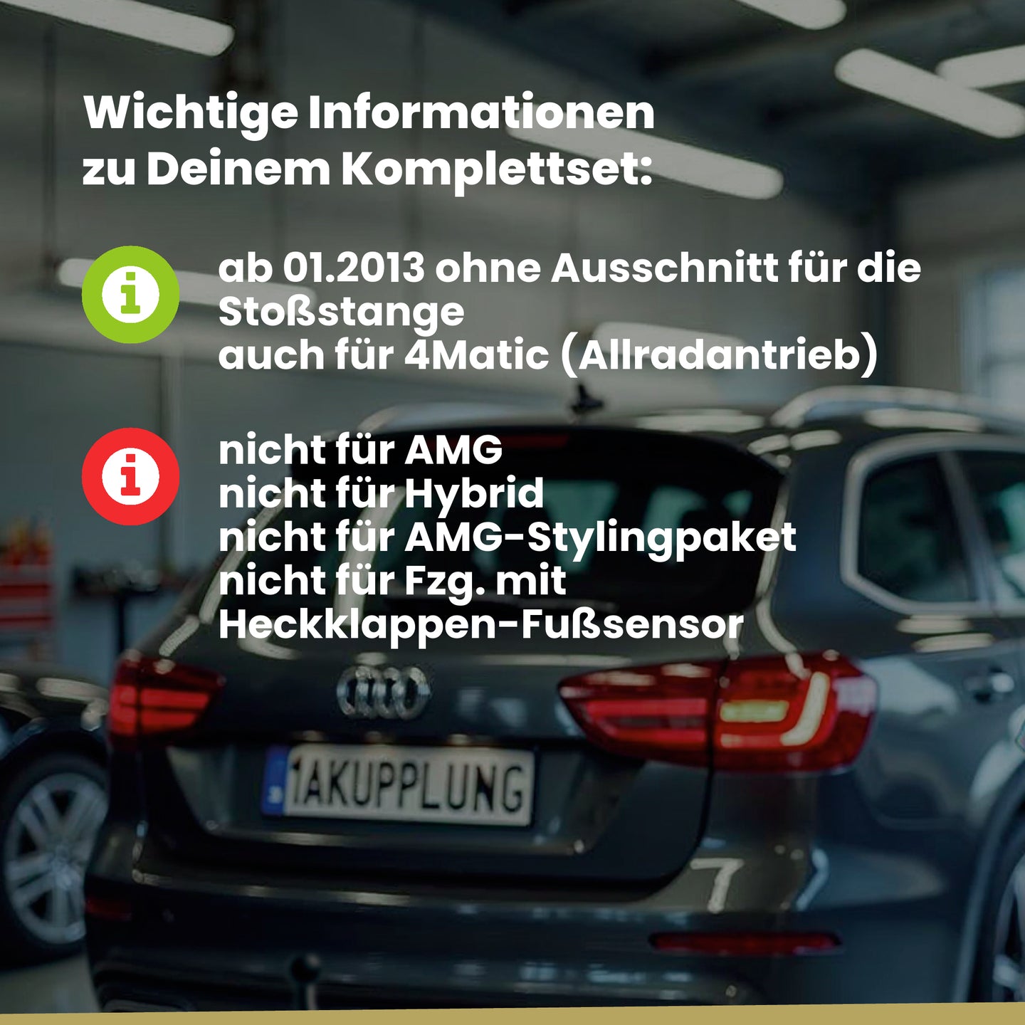 Nicht für AMG. Nicht für Hybrid. Nicht für AMG-Stylingpaket. Nicht für Fzg. mit Heckklappen-Fußsensor. Ab 01.2013 ohne Ausschnitt für die Stoßstange. Auch für 4Matic (Allradantrieb).