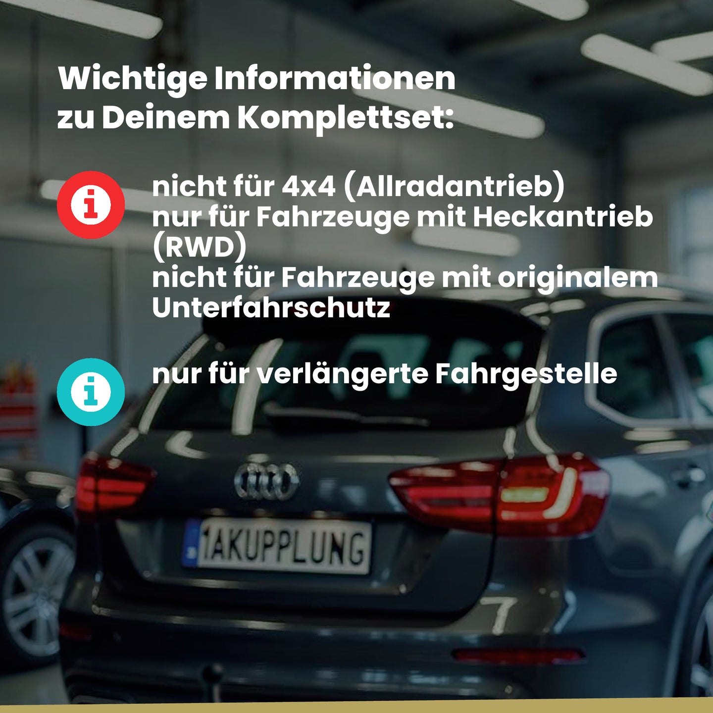 Nicht für 4x4 (Allradantrieb). Nur für Fahrzeuge mit Heckantrieb (RWD). Nicht für Fahrzeuge mit originalem Unterfahrschutz.