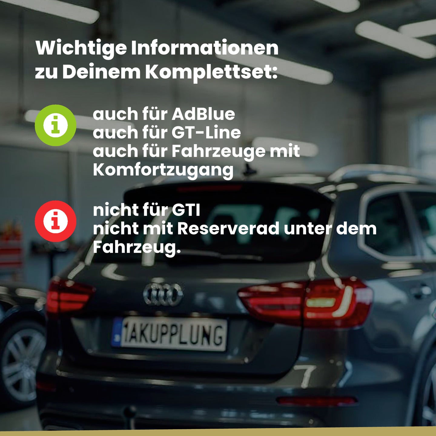 Nicht für GTI. Nicht mit Reserverad unter dem Fahrzeug.. Auch für AdBlue. Auch für GT-Line. Auch für Fahrzeuge mit Komfortzugang.